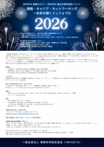 新しい年を迎え、協会の一層の発展を期し、あわせて皆さま方の親睦と情報交換の場として、下記のように「2026年 INFOSTA 新年パーティー」を開催いたします。多数のご出席をお待ちしております。